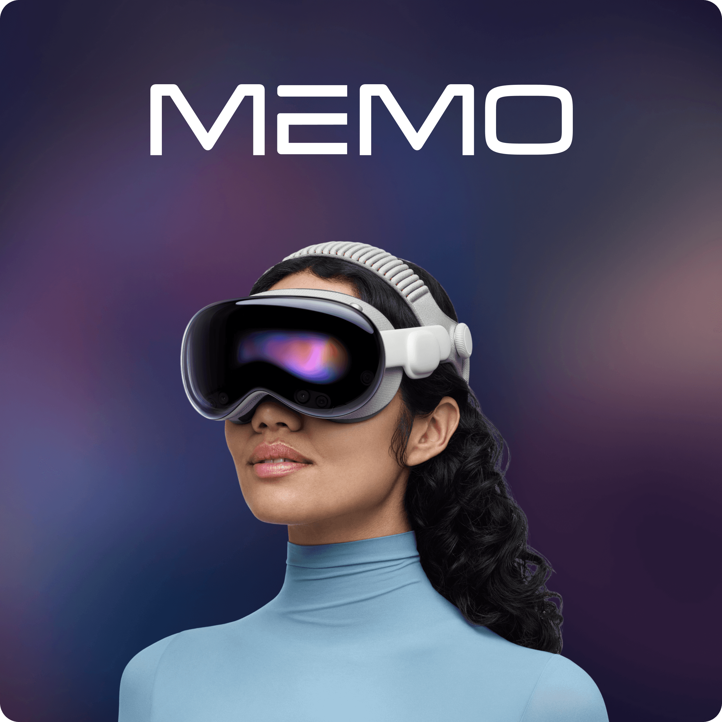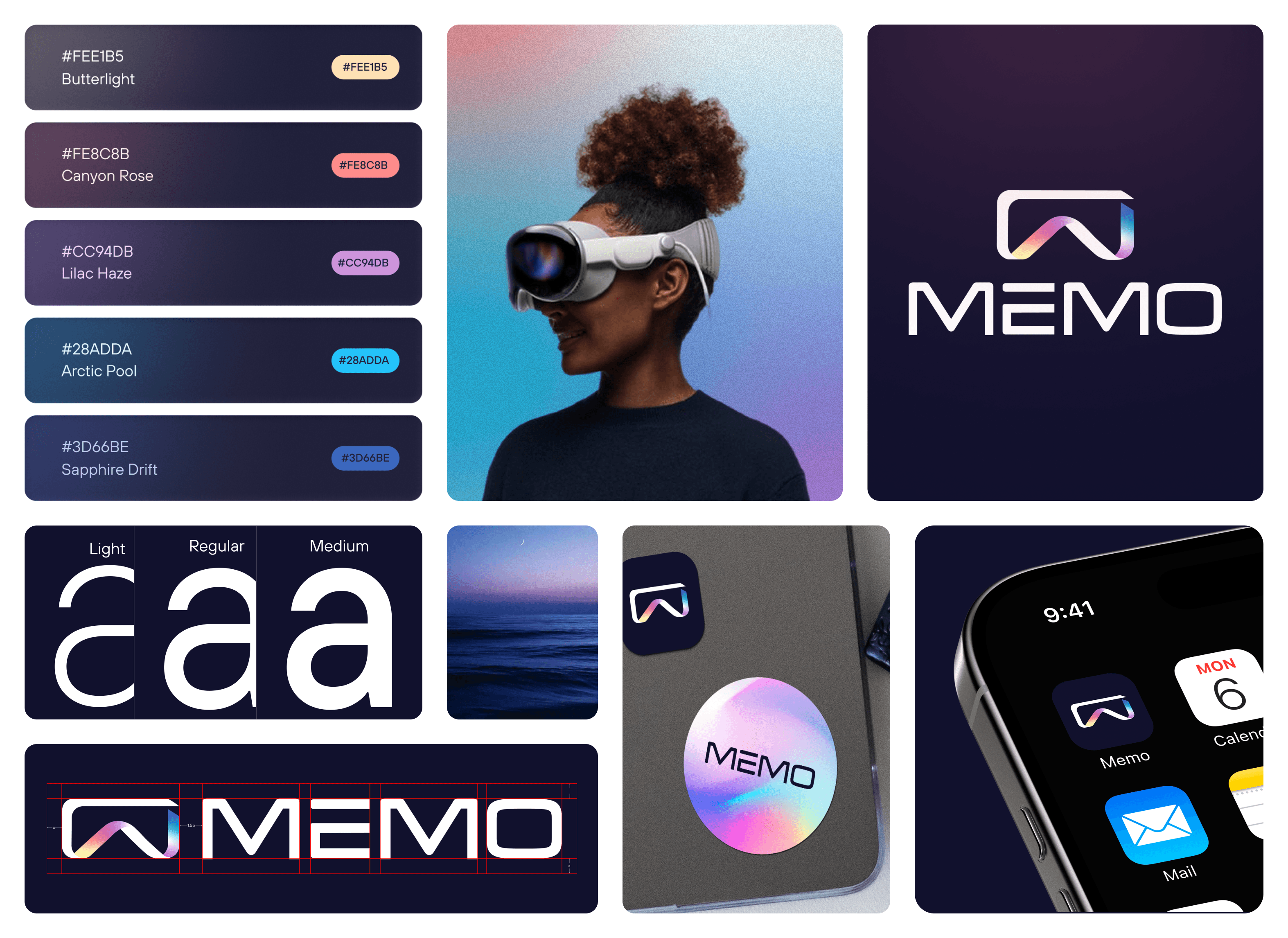 The Memo logomark draws from two sources: the letter M for memories, and the form of a VR headset. The shape is fluid and ribbon-like because memories are not static. They shift, evolve, and come back differently each time.